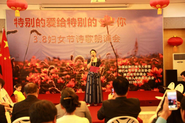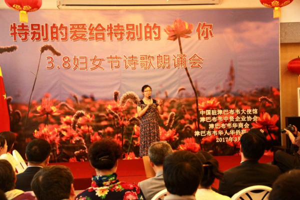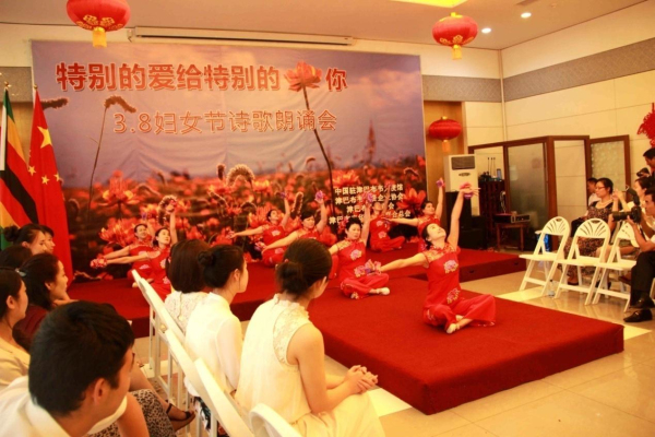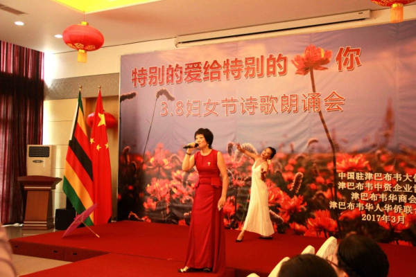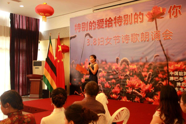 3月8日下午,从中国驻津巴布韦使馆活动大厅里不时传出阵阵的配乐诗朗诵,“特别的爱给特别的你——3.8妇女节诗歌朗诵会”正在如火如荼地进行中。使馆全体工作人员以及来自在津中资企业商会、华商会、华人华侨联合总会的负责人和妇女代表、以及援津各专家组、孔子学院等150余名嘉宾欢聚一堂,以中国传统的文化形式共同庆祝“三八国际劳动妇女节”。