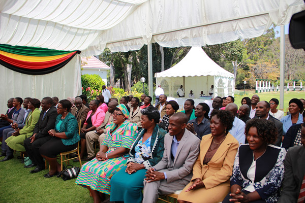 2017年9月14日上午,津巴布韦总统穆加贝及夫人格蕾丝在总统府隆重举行“总统奖学金”留学生赴华送行仪式。中国驻津大使黄屏、新闻部长兼“总统奖学金”项目负责人马绍威、外交部长蒙本盖圭、国防部长塞克拉马伊、总统与内阁办公室首席秘书西班达,青岛恒顺众昇集团驻津负责人刘白雪以及近百名学生及学生家长出席了送行仪式。