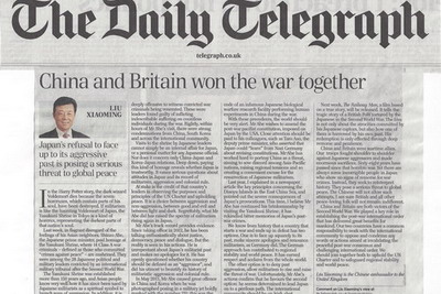 China and Britain were wartime allies. Our troops fought shoulder to shoulder against Japanese aggressors and made enormous sacrifices. Sixty-eight years have passed since that horrible war. Yet there are always some incorrigible people in Japan who show no signs of remorse for war crimes. Instead, they seek to reinterpret history. They pose a serious threat to global peace. The Chinese will not allow such attempts. I am sure British and all other peace-loving folk will not remain indifferent.