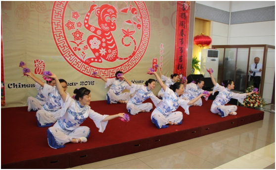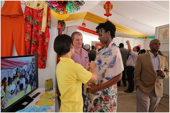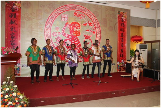 招待会上,由张爱萍大使夫人编舞、使馆妇女小组成员表演的《女人花》手花舞、津巴布韦大学孔子学院合唱团的《说唱脸谱》、小朋友表演的《恭喜你》等节目博得全场阵阵喝彩。