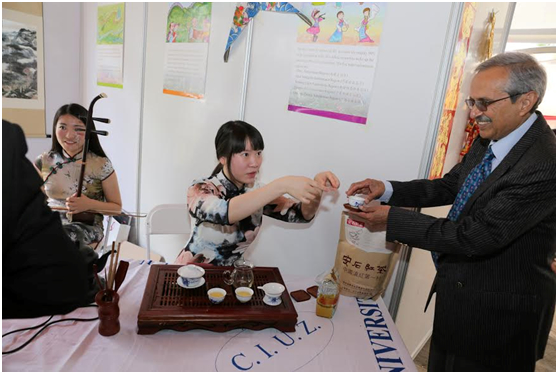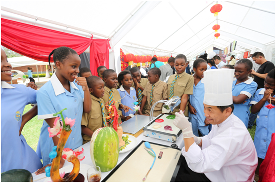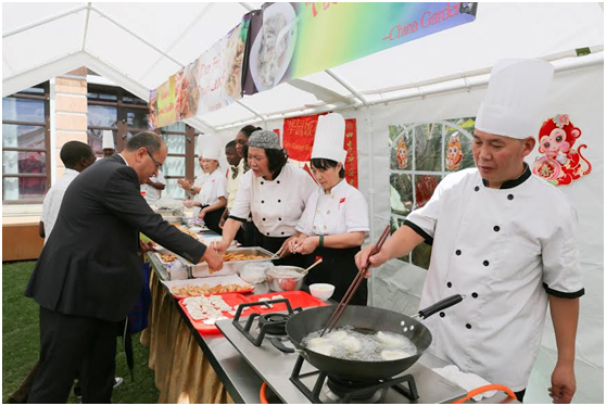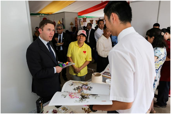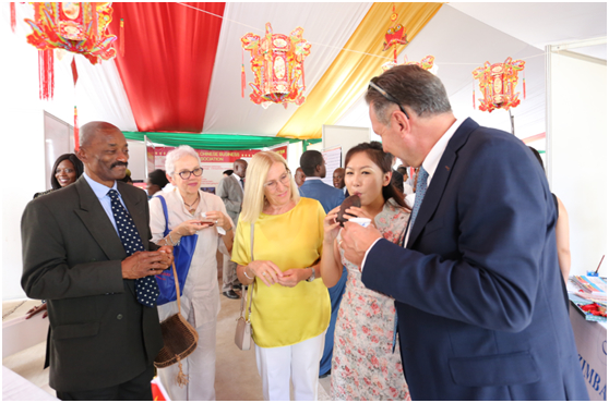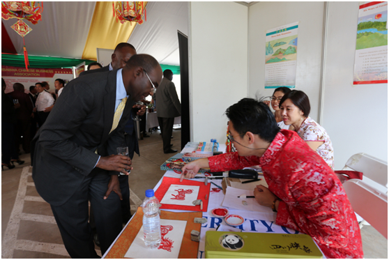 嘉宾们饶有兴致地参观了使馆和当地华侨华人精心准备的二十多个展台。内容包括现场制作展示传统新春小吃冰糖葫芦、汤圆、水饺、糖人等,展现在津华侨华人风采和贡献的中资企业商会、华商会、华联会、知名企业、援津医疗队、军事专家组、农业专家组、孔子学院、摄影协会、“爱心妈妈”社团等在津生产运营情况,以及体现中华传统文化魅力的书法、国画、篆刻、剪纸、茶道、民乐等。