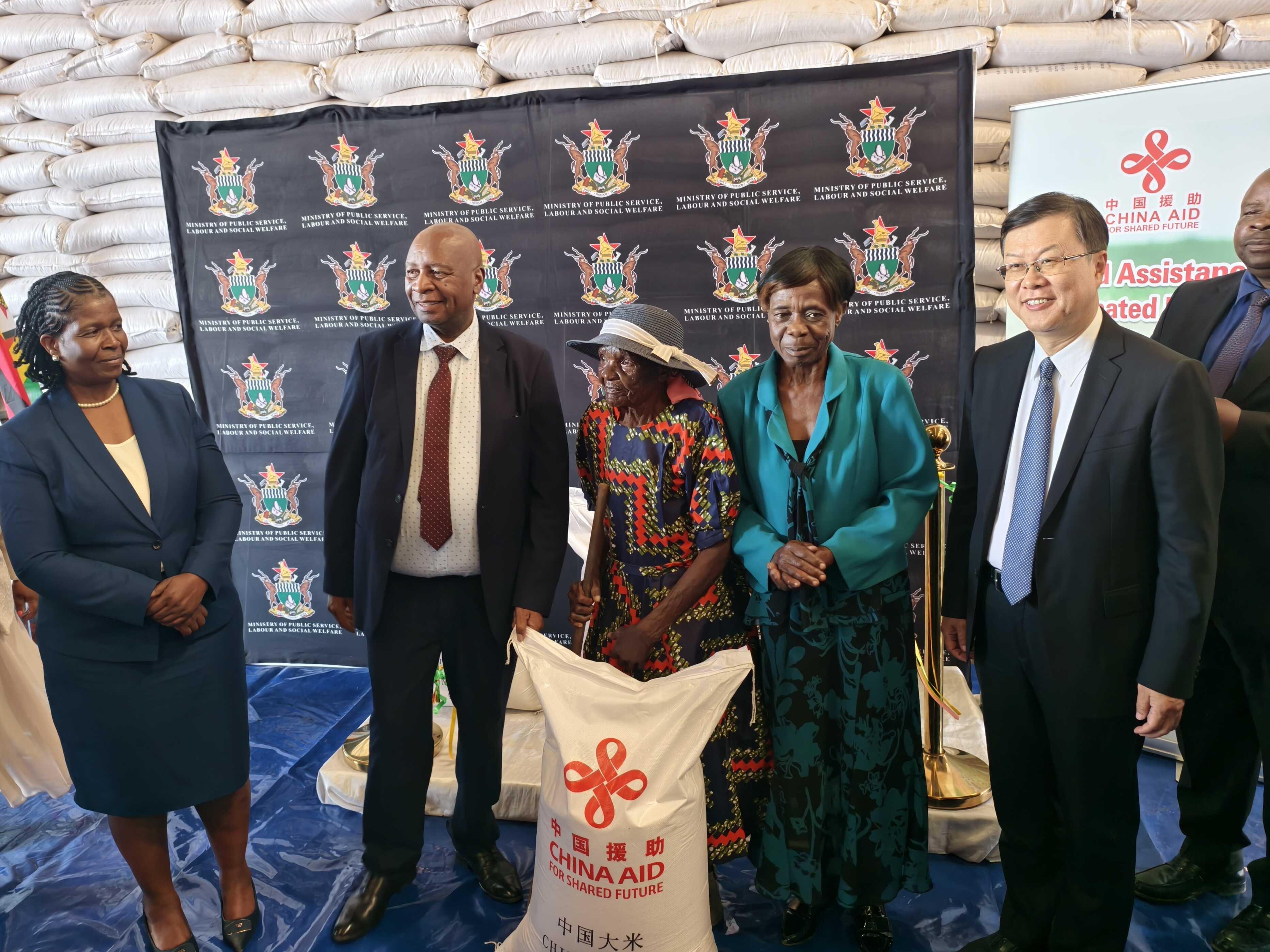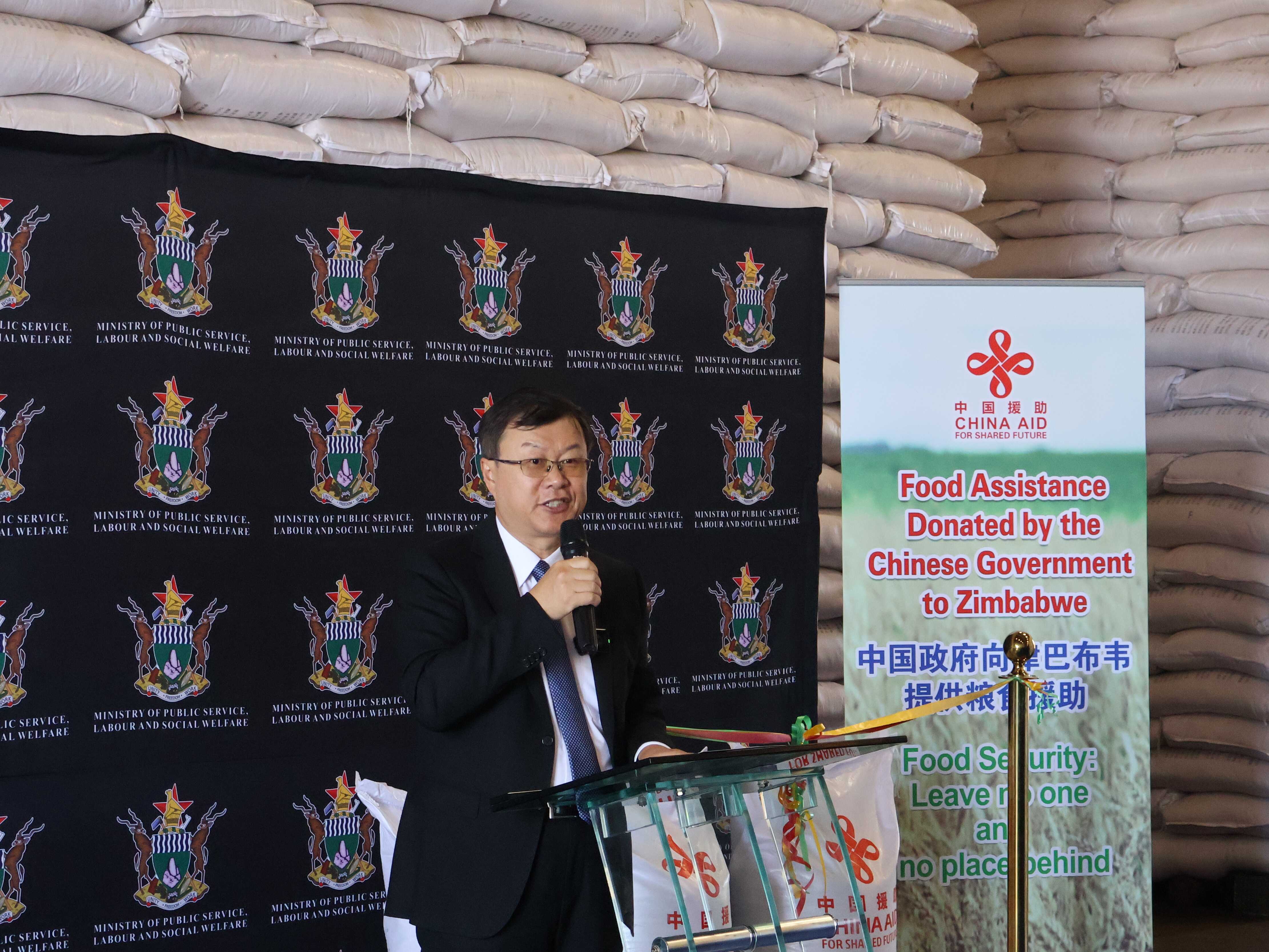 3月23日,中国驻津巴布韦大使周鼎与津公共服务、劳工和社会福利部长莫约共同出席中国政府对津粮食援助交接仪式,并向困难民众和有关机构发放粮食。津社会福利部副部长蒂娜等官员、受援民众和有关机构代表在场见证。