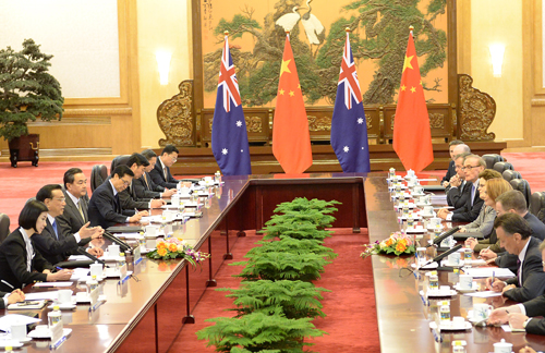 李克强表示,稳定健康发展的中澳关系符合两国根本利益,也有利于地区和世界的和平、稳定与发展。近年来,中澳关系继续蓬勃发展,双边贸易额在国际金融危机背景下翻了一番,人文交流日益活跃,合作成果丰硕。今天,我们正式启动两国总理年度定期会晤机制。中方愿与澳方一道,秉持《中澳联合声明》精神,密切高层交往,增进战略互信,建立和充实完善中澳相互信任、互利共赢的战略伙伴关系。同时,我们还确定建立外交与战略对话、战略经济对话等机制,促进多渠道交流合作。