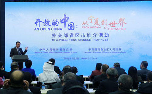 2016年3月2日,以“开放的中国:从宁夏到世界”为主题的外交部首次省区市全球推介活动在外交部蓝厅举行。外交部长王毅、宁夏回族自治区党委书记李建华先后发表致辞,自治区主席刘慧进行推介。100多个国家的驻华使节、国际组织驻华代表以及商界代表、中外专家学者和媒体记者等500余人出席。