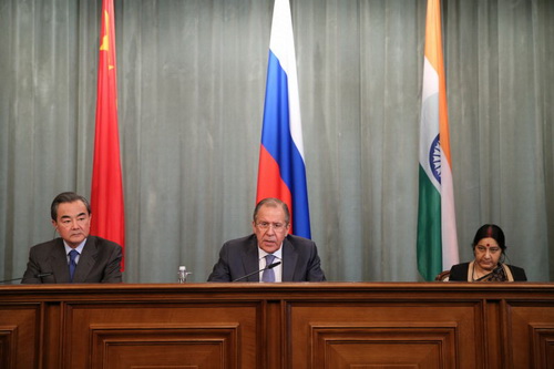 2016年4月18日,外交部长王毅在莫斯科出席中俄印外长第十四次会晤后同俄罗斯外长拉夫罗夫、印度外长斯瓦拉吉共同会见记者时表示,中俄印应推动五大领域、12个方面的务实合作。