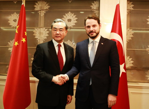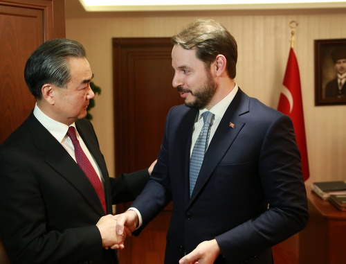 当地时间2016年11月14日,外交部长王毅在安卡拉会见土耳其能源部长、中土经贸联委会土方主席阿尔巴伊拉克。