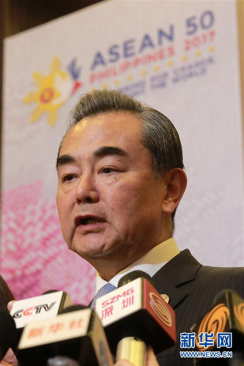 当地时间2017年8月7日,外交部长王毅在菲律宾马尼拉出席东亚合作系列外长会后举行中外媒体吹风会。