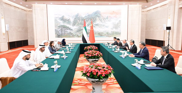 2026年4月13日,中共中央政治局委员、中央外办主任王毅在京会见陪同阿联酋阿布扎比王储哈立德访华的阿总统中国事务特使哈勒敦。